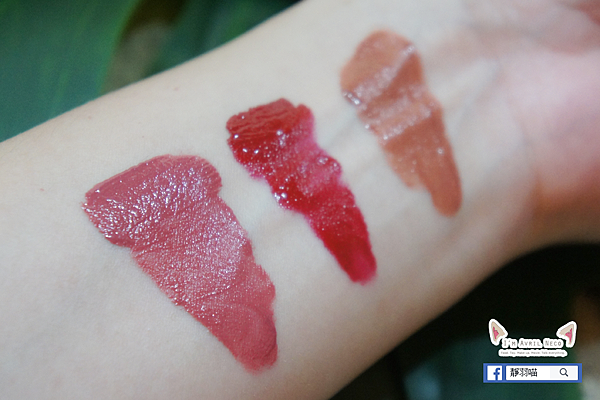 唇刷應該跟市面上的唇蜜裡的唇刷沒有太大的差別,三款的顏色都很飽和,上唇之後顏色很飽和,