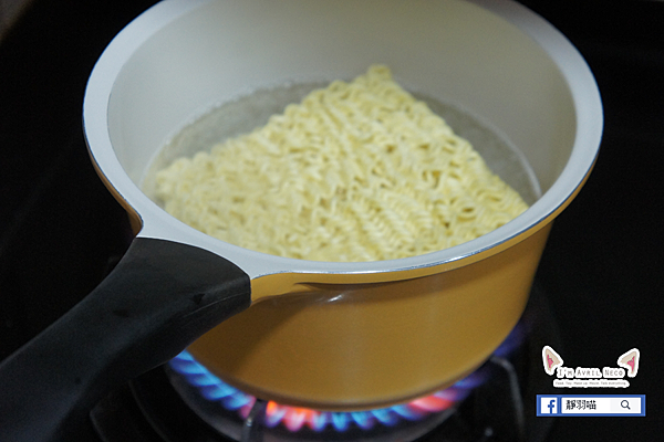 然後,就可以把麵丟下去煮,它的麵體是偏粗,比較耐煮的那種類型