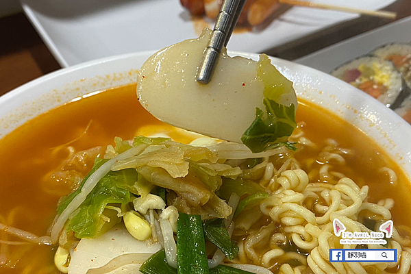 裡面還有韓國年糕,吃起來軟軟的。泡在熱湯裡久一點的年糕,咬一口還會微微的拉絲,真的嚇到我